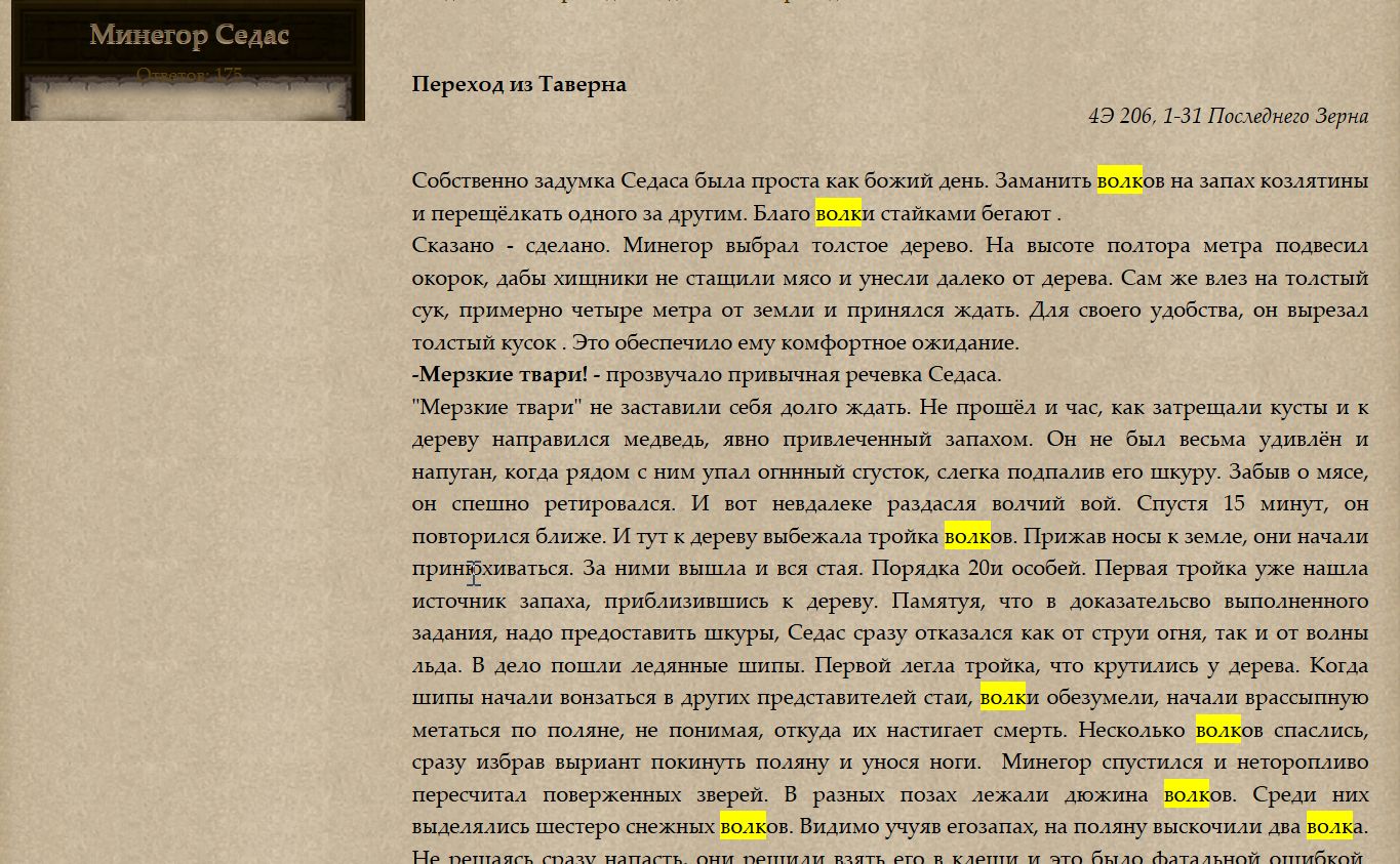 Тем более при желании можно в любой момент зайти в профиль игрока, там нажать "все сообщения". Или, что удобнее, воспользоваться поиском в шапке форума - там гораздо удобнее искать пропущенное/старое/подзабытое. Можно посмотреть сообщения не только от конкретного игрока, но и в конкретном владении, в том числе по ключевым словам наподобие названия места, в котором был отыгрыш.